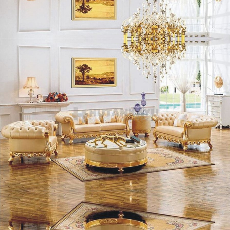 Set Kursi Tamu Sofa Chester Ukir Emas Jok Leather perbaduan Ukiran dengan Jok Kancing dibagian atas jok membawa kesan mewah